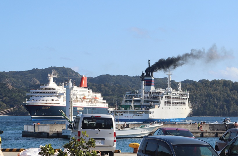 左側はこの回で引退するという豪華客船日本丸。右側はわれらが小笠原丸。出航の際、汽笛を鳴らす。