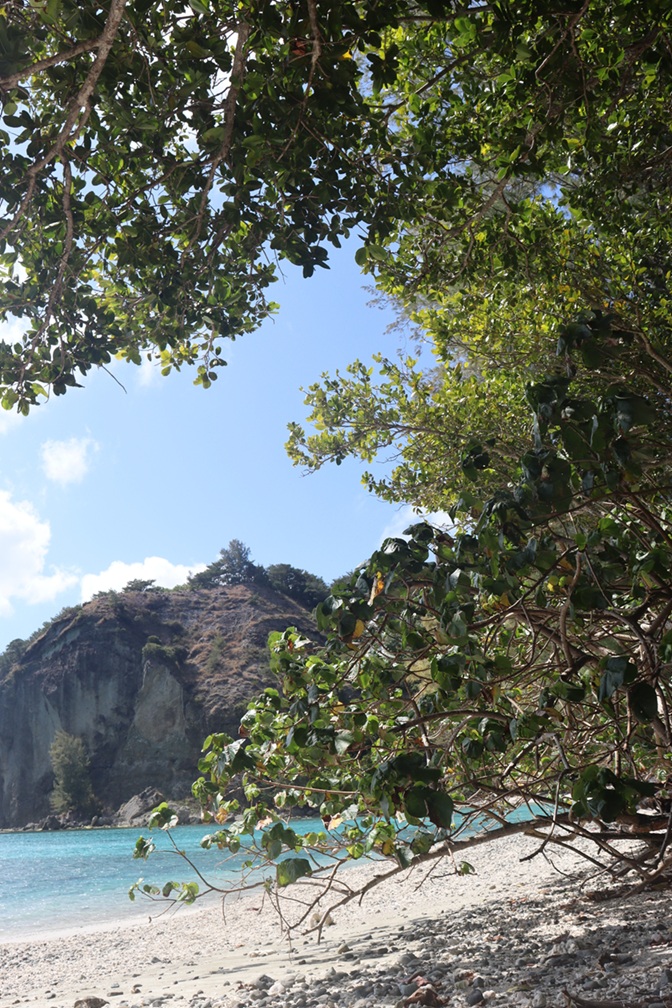 春に紅葉する小笠原の広葉樹モモタマナと堺浦の沈船